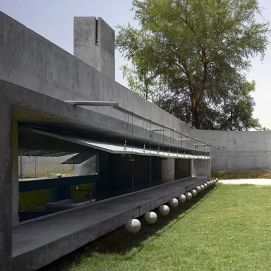 Ahmedabad, India .- Utilizando máquinas de Atwood, que vendrían siendo poleas fijas y uno de los ejemplos más clásicos de la segunda ley de Newton, la firma Matharoo Asociados construyó algo parecido a persianas de concreto en una casa hecha para un empresario Indú, quien utiliza la instalación como criadero de peces y terraza de descanso. Haciéndole honor a su nombre, el lugar se conoce como House with Balls (Casa con Bolas). Cuenta con dos fachadas que utilizan bolas de concreto como contrapesos para mantener los paneles abatibles de concreto en la posición requerida.
