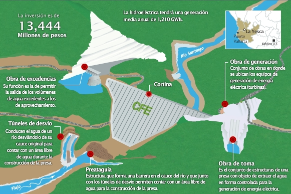 Nayarit, México .- La Yesca contribuirá a satisfacer la demanda de electricidad en el oeste del país, sin liberar dióxido de carbono a la atmósfera. Sus dos turbo-generadores tendrán una potencia nominal de 750 MW (350 MW cada una), que producirán electricidad con una media anual de 1.210 gigavatios por hora, lo cual es suficiente energía para abastecer el estado de Nayarit durante un año y medio.